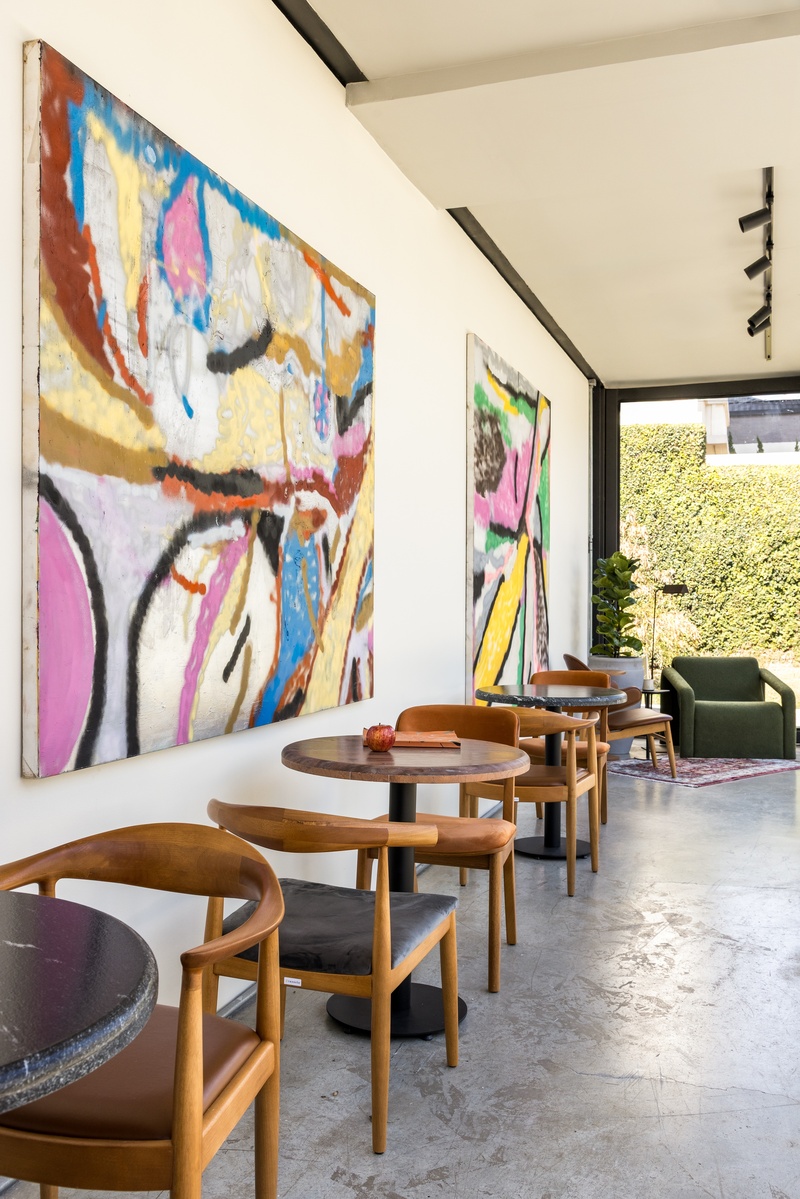 A ideia central foi criar um ambiente que estimula encontros de pessoas, ideias e propósitos, em um espaço que combina o conforto de uma casa com a energia de um clube de convivência. Os materiais e acabamentos reforçam essa atmosfera: pedras naturais com veios marcantes, tecidos aveludados, cores quentes e texturas convidativas. A mistura entre peças vintage e elementos contemporâneos cria um cenário familiar e, ao mesmo tempo, atual.